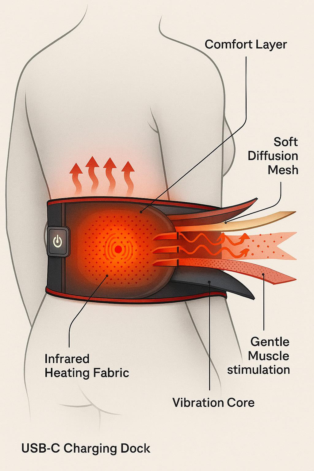 That heavy, draining ache you feel by mid-day is muscle tension robbing your body of oxygen and mobility. ThermaWrap restores both instantly. Infrared heat opens blood flow while gentle vibration massages deep stiffness. The result? Lightness. Warmth. Movement. The feeling of finally being in your body again — not fighting it.